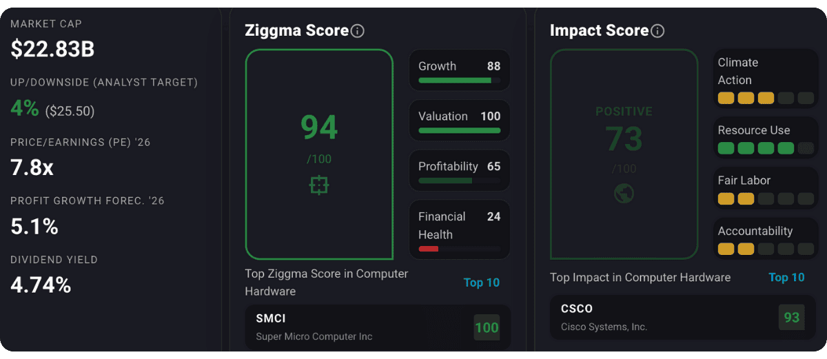 HP outperforms many hardware peers on profitability, efficiency, and shareholder discipline, ranking in the 88th percentile for growth with a Ziggma Score of 91.
