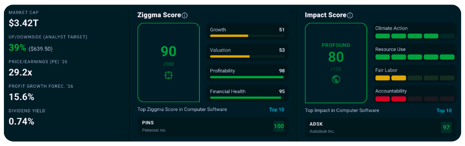Microsoft’s Ziggma Score of 90 out of 100 reflects this strength. Profitability scores 98, and financial health scores 95, placing Microsoft among the strongest companies globally.